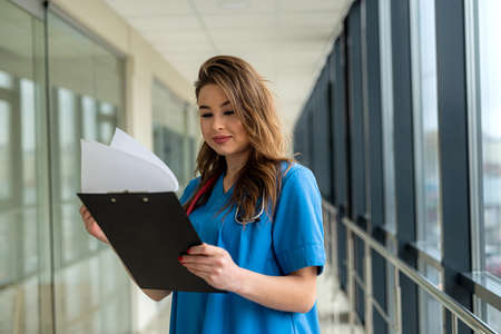 portrait of beautiful nurse in blue uniform with clipboard in modern hospital. medical concept