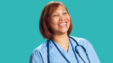 Upbeat chilled asian clinic worker having burst of laughter while at work. Close up of happy nurse enjoying amusing discussion with colleague during shift break, isolated over studio background