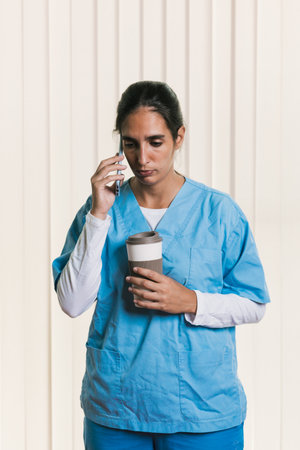 Nurse talking on phone and holding coffee during break