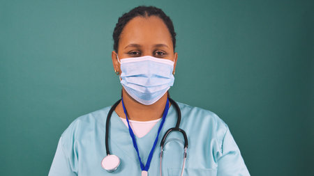 Portrait of african american practitioner nurse wearing protective medical face mask against virus working at sickness treatment in studio with blue background. Health care service