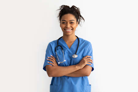 Beautiful young african-american doctor or nurse with stethoscope smiling isolated over white studio background. Copyspace. Concept of healthcare and medicine, taking care, treatment, diagnostics.