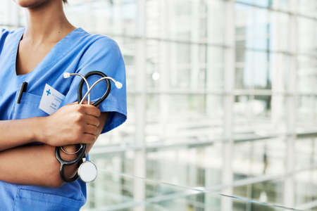 Midsection of female doctor wearing scrubs with stethoscope and arms crossed in hospital corridor. medical professional at work.