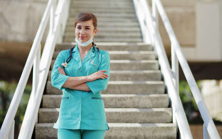 Young female scrub nurse wear blue uniform and face mask, standing in hospital entrance