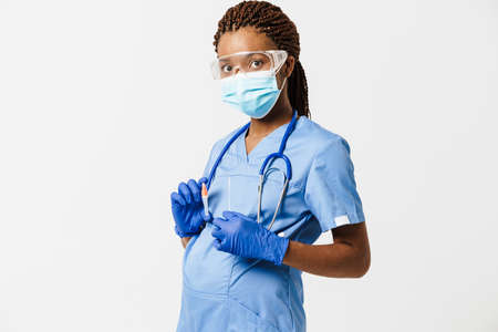 Black doctor wearing face mask posing in safety glasses isolated over white background