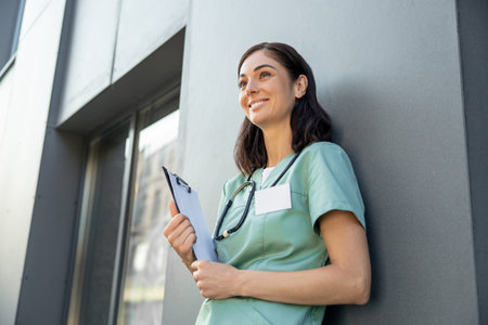 coronavirus pandemic. Side view of pensive modern medical doctor woman in uniform with stethoscope and medical mask looking into the distance outside in the city.