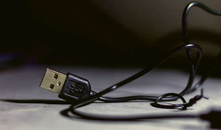 Black usb cord for transferring digital data on a white background. Digital data transmission technologies. Computer connection. Charging mobile devices. USB cord for charging the phone.
