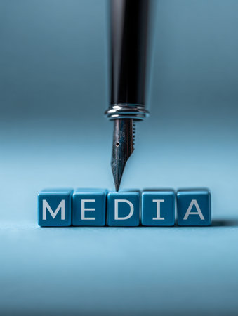 A sleek fountain pen tip hovers above vibrant blue cubes spelling media, set against a gentle blue backdrop, evoking themes of storytelling, dialogue, and knowledge dis