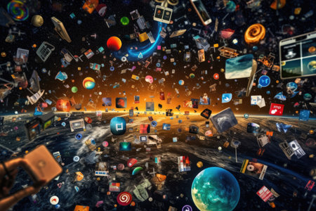 massive social media, devices, data, icons, floating around the earth. beautiful Generative AI AIG32