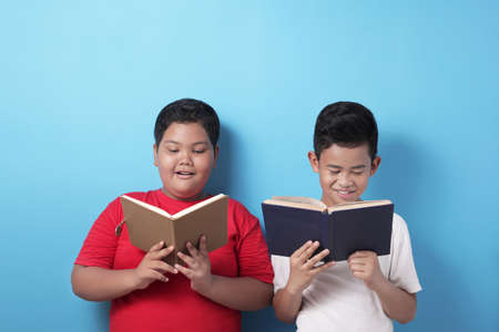 Portrait of happy smart fat Asian student boy looking up thinking expression while reading a book, against blue background