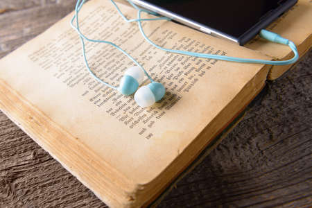 Headphones and mobile phone on the old book. Concept of listening to audiobooks.