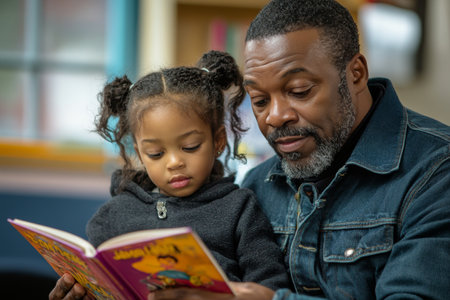A father reads a book to his daughter in a vibrant garden. They share smiles as they engage with the story, fostering a joyful learning moment.