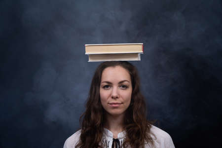 Girl holding books on the head. Concept of wisdom, knowledge and self-education