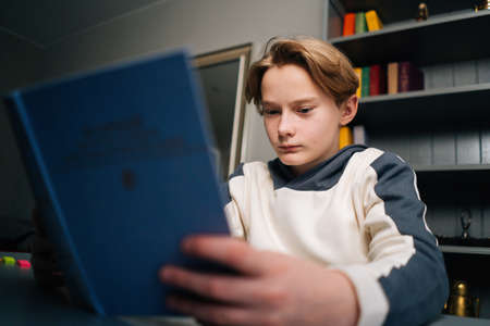 Side close-up view of smart serious pupil boy reading school book sitting alone at desk in light children room near window. Child schoolboy doing homework at home.