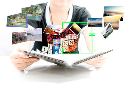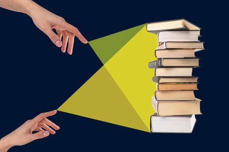 Light ray coming from woman hand to books stack on black background. Reading power, enlightenment, learning new information concept. Collage. High quality photo