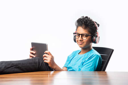 Portrait of Happy asian boys, Brother on floor with laptop and books isolated on white background, Education and learning with technology concept