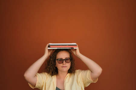 Calm girl holding books on her head on orange background in sunglasses. Woman with curly hair in casual clothes. Student is holding books. Copy space