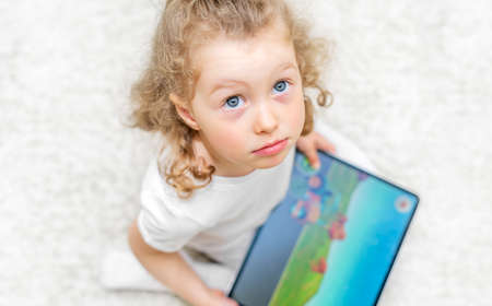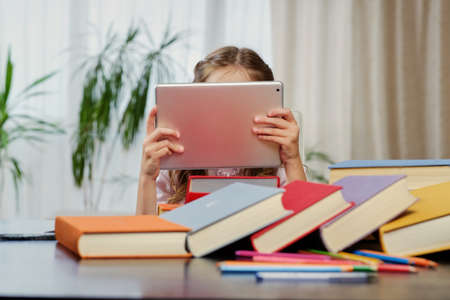 Little girl looking at the tablet PC in a classroom. Colorful books at the table.