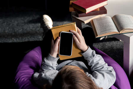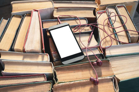 Mobile phone with blank screen with copy space and old books. Electronic book concept.