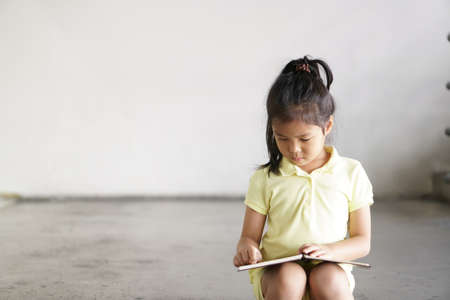 asian child cute or kid girl happy reading story book or student enjoy for learn to tale read with education summer study on street footpath and poor at nursery preschool or school and kindergarten