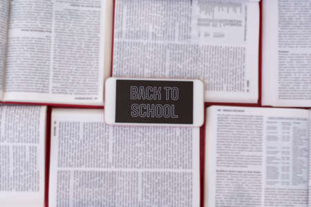 Welcome back to school background. Top view of a smart mobilephone over lot of opened books. Wisdom, knowledge, education concept.