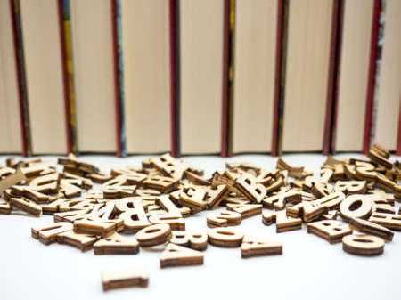 on the table is an old book. Reading books. Letters fly out of the open book.