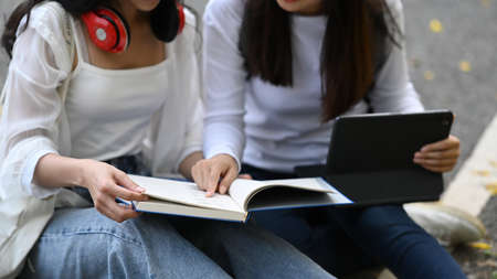 Cropped shot of two female college students using computer tablet learning and preparing for exam.