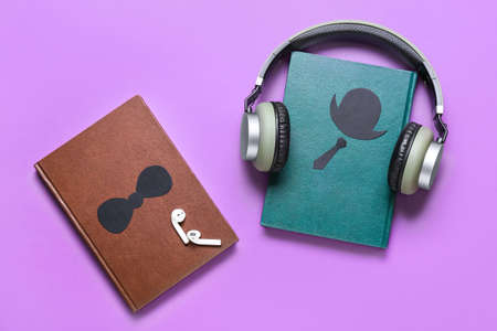 Black headphones on a stack of books and flying notes. The concept of audiobooks