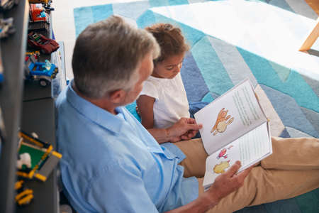 Hispanic Grandfather And Granddaughter Sitting On Floor Of Childrens Bedroom Reading Book Together