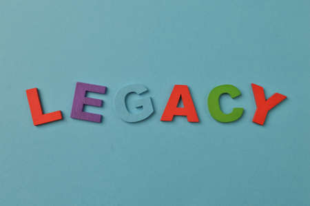 Colorful alphabet letters with text LEGACY isolated on a blue background