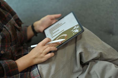 Cropped image of a young woman using a stylus pen and digital tablet with a graphic charts information on-screen while sitting on the comfortable sofa.