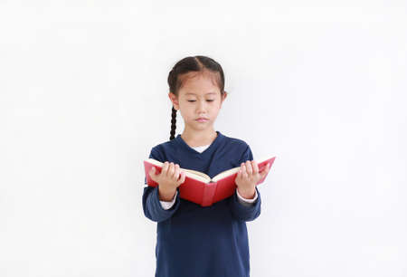 Asian little child girl in casual school uniform holding open book isolated on white background in studio shot. Education concept