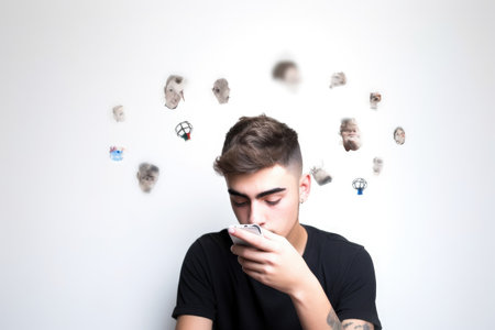 portrait, young person and phone on white background with social media addiction, scroll or search, created with generative ai