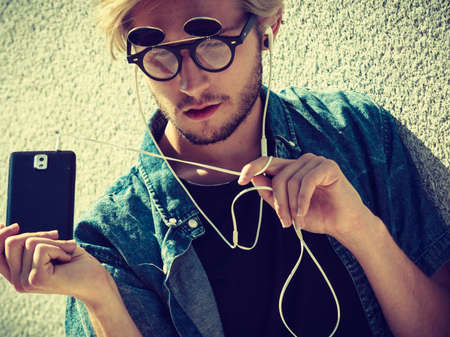 Men fashion, technology, urban style clothing concept. Hipster guy standing on city street wearing jeans outfit and eccentric sunglasses listening to music and holding phone