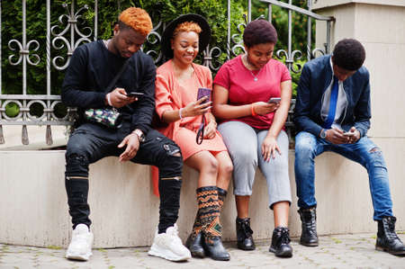 Four african friends having fun outdoors. Two black girls with guys with mobile phones.