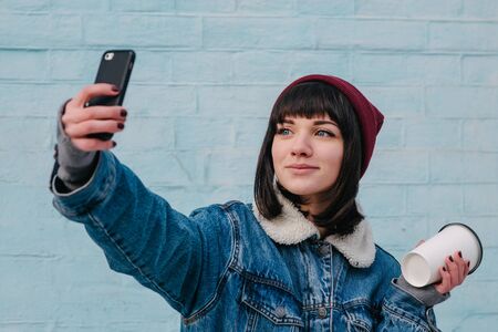 young smiling girl holding a hipster coffee and photographed on phone