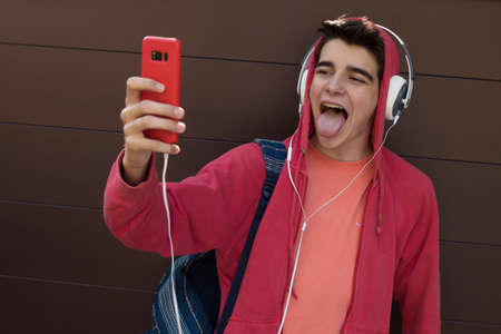 BISHKEK, KYRGYZ REPUBLIC - APRIL 14, 2018: Selfie time. Handsome friends making selfie and smiling while resting at street music festival.