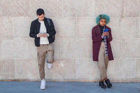 Multicultural group of friends using cellphones outdoors - Students browsing internet holding mobile smart phones standing beside wall