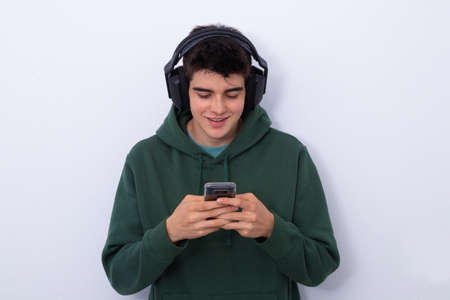 handsome guy headphone music technology with phone isolated background