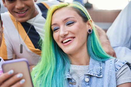 Teen girl with color hair looking at the smartphone screen with happy smile