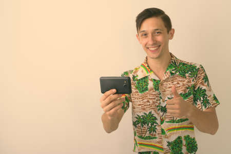 Studio shot of young happy tourist man smiling while giving thumb up and taking picture with mobile phone against white background