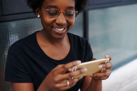 Close up view young woman watching online movie with smart phone.
