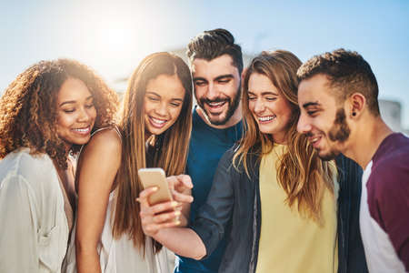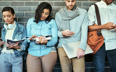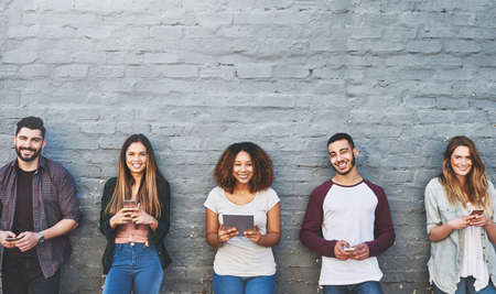 The digital revolution is now. Shot of a group of young friends using their wireless devices together outdoors.