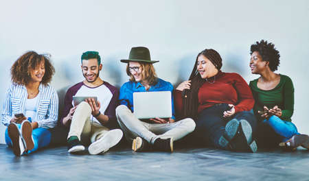 Its a wireless world were living in. Studio shot of a group of young people sitting on the floor and using wireless technology.