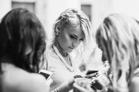 Kiev, Ukraine, July, 2015: Black and white photo of three female students holding mobile phones