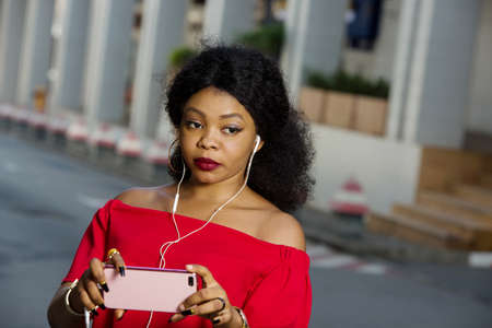 Asian thai backpacker woman using smartphone listen to music with earphones walking out from metro station.