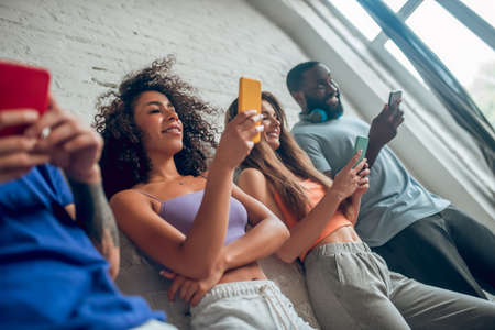 Young stylish friends sitting in a row with smartphones over the white wall background. Hanging out using phones separately. Dependence on gadgets and the Internet