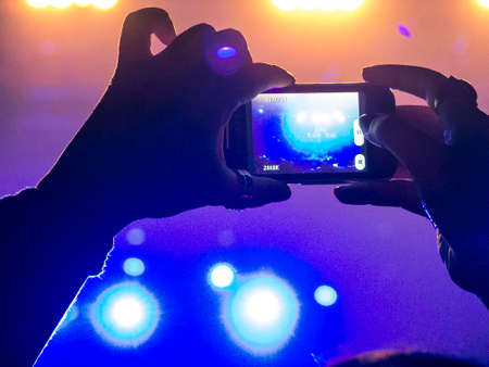 Krakow, Poland - September 20, 2014: Abstract background art of a cellphone camera capturing an artist performing rock music concert.