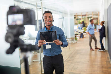 Young business man in front of the video camera while streaming live for a tutorial