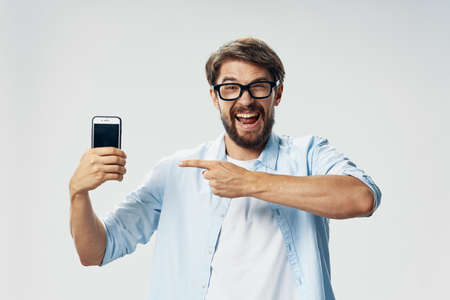 Portrait of young amused bearded brunet holding smartphone and gesturing against light wall.