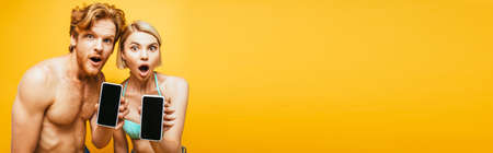 horizontal image of shocked blonde woman in swim bra and shirtless man showing smartphones with blank screen isolated on yellow